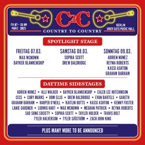 Das C2C: Country to Country Festival wird von Freitag, den 07. März bis Sonntag, den 09. März 2025 in der Uber Eats Music Hall sowie rund um das Areal des Uber Platzes in Berlin stattfinden.