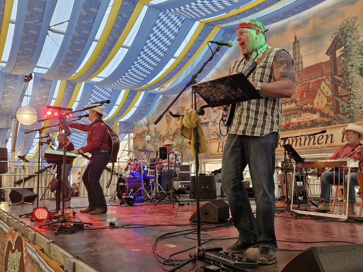 Am 15.04. 2026 war dann die Rick Allen Band an der Reihe und die zählt ja seit vielen Jahren zu den festen Größen in Franken. Sie wurde gegründet von dem in Nürnberg lebenden Amerikaner Rick Allen und hat sich weit über die Region hinaus einen Namen gemacht. Im Einzelnen haben wir diese sechs exzellenten Musiker ja ebenfalls schon bei früheren Auftritten vorgestallt vorgestellt. Das Musikprogramm ist auch hier sehr abwechslungsreich und von den großen Hits der letzten 20 Jahre, wie sie die Tänzer so sehr schätzen, fehlt eigentlich keiner. Auch ein paar ganz aktuelle Titel aus Nashville werden immer wieder neu ins Programm genommen. Auch diesmal hat sich der Besuch gelohnt im Festzelt, wegen der guten Musik und der tollen Atmosphäre. Heuer wurde freilich der Ansturm von früheren Jahen freilich noch übertroffen. Selten hat man so viele begeisterte Tänzer auf einmal gesehen. Hoffen wir, dass es bald wieder mehr Auftritts-Möglichkeiten für diese Formation gibt. Wo das nicht geht, kann man ja Rick Allen auch mit seinem Partner Chris Schultheis als Duo erleben.