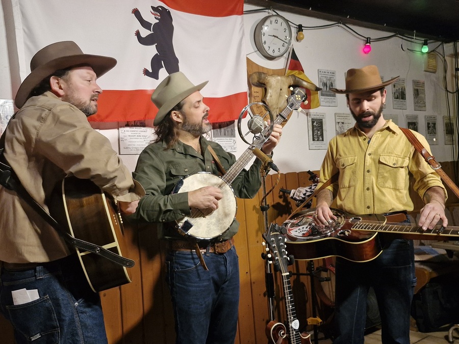 Schon die Wurzeln der drei Musiker sind bemerkenswert. Jason Serious (Gesang, Gitarre, Harmonika) stammt aus Maryland, USA. David Steward Ingleton (Gesang, Banjo) kommt aus der Nähe von Sydney in Australien und der dritte im Bunde, Tomás Peralta (Gesang, Dobro, Mandoline, Bass) ist in Chile beheimatet. Eine solche Kombination hatten wir in der Tat noch nie. Kennen gelernt haben die drei sich auf ihren Streifzügen in Deutschland und sie leben mittlerweile alle drei in Berlin. „Wenn wir nicht gerade Döner essen, machen wir Musik und organisieren Konzerte“, grinste David Ingleton bei einem Gespräch in der Pause. Mit einer Prise Humor und Erläuterungen in tadellosem Deutsch leiten sie dann auch ihr Programm ein.